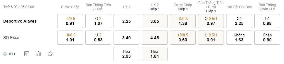 Trong khi đó nhìn sang Eibar, đội bóng này chỉ có đúng 1 thắng lợi trong 5 lần ra sân gần nhất, còn lại là 2 thất bại và 2 kết quả hòa. Vì vậy các chuyên gia nhận định, lựa chọn Alaves sẽ là hợp lý hơn trong kèo đấu này.