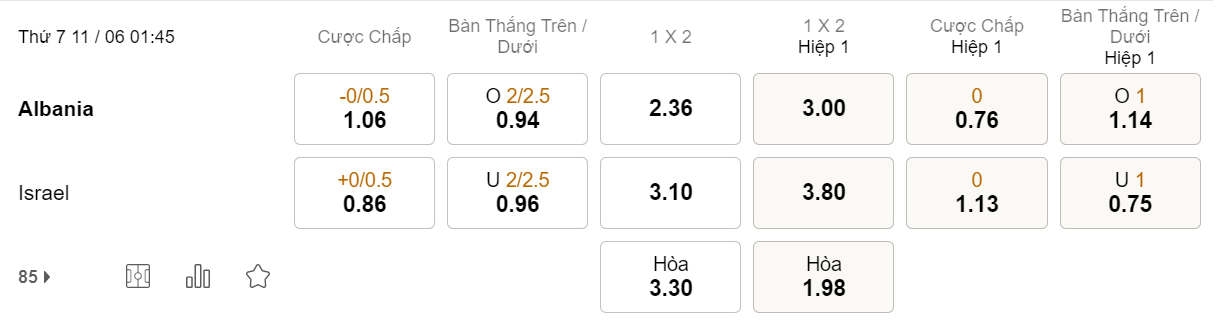 Soi kèo hiệp 1 Albania vs Israel: 0.76*0*1.13