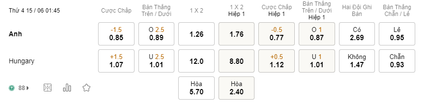 Soi kèo Châu Á Anh vs Hungary: 0.85*1.5*1.07
