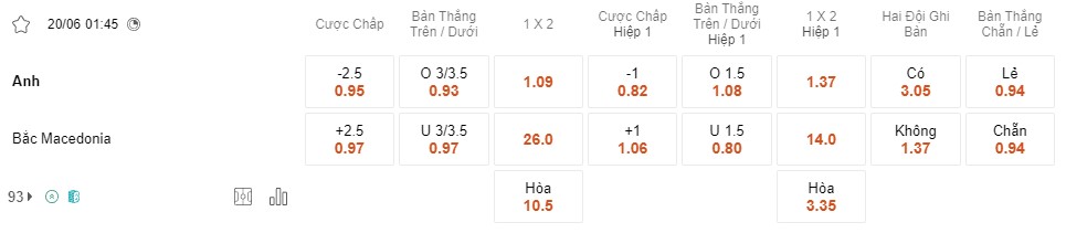 Soi kèo hiệp 1 Anh vs Macedonia: 0.82*1*1.06