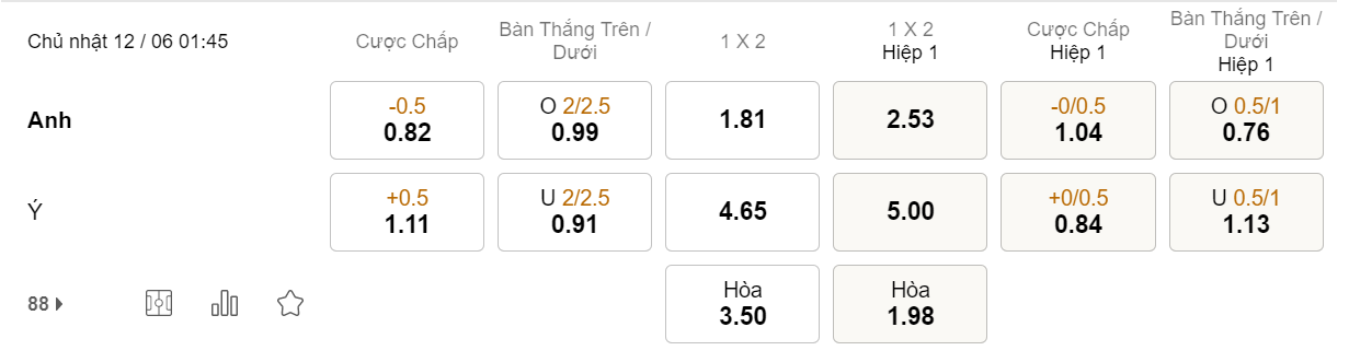 Soi kèo tài xỉu Anh vs Ý: 0.99*2/2.5*0.91