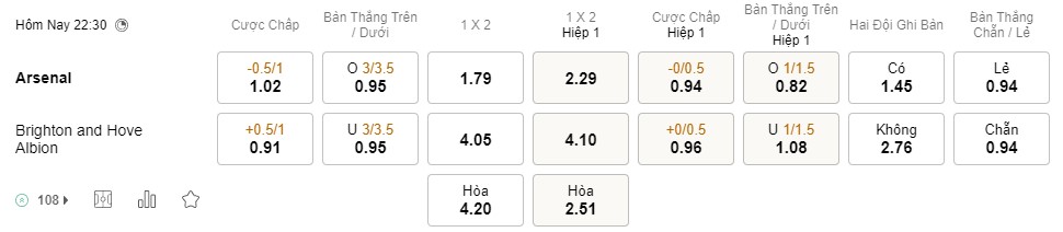 Tỉ lệ kèo Arsenal vs Brighton