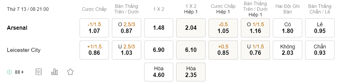 Soi kèo châu Á Arsenal vs Leicester: 1.07*1/1.5*0.86