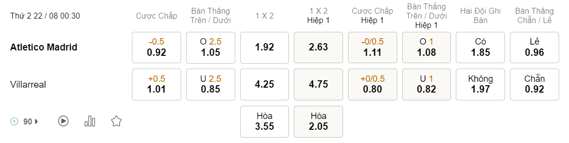 Với phong độ ổn định trên sân nhà, Atletico Madrid thường tự tin nhập cuộc. Họ cũng đã mở tỉ số ở 2/3 lần gần nhất đối đầu Villarreal. Do đó, khả năng cao đội chủ nhà được đánh giá cao hơn sẽ sớm có được bàn thắng sau hiệp thi đấu đầu tiên.