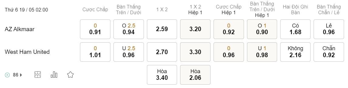 Tỉ lệ kèo AZ vs West Ham