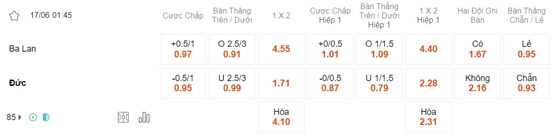 Soi kèo hiệp 1 Ba Lan vs Đức: 1.01*0/0.5*0.87