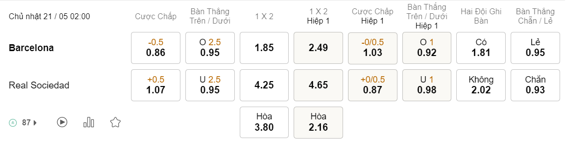 Soi kèo hiệp 1 Barcelona vs Sociedad: 1.03*0/0.5*0.87