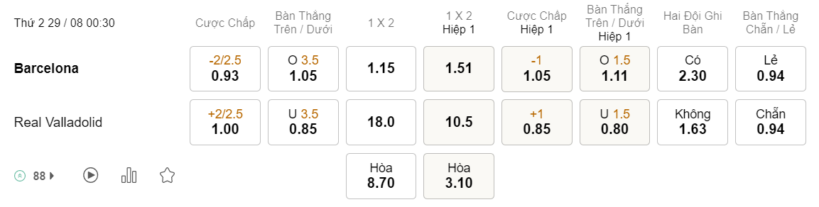 Soi kèo hiệp 1 Barcelona vs Valladolid: 1.05*1*0.85