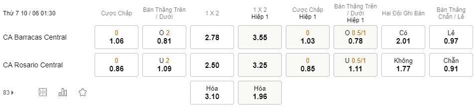 Soi kèo châu Á Barracas vs Rosario Central: 1.06*0*0.86