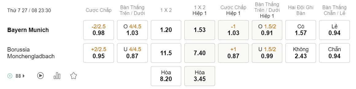 Soi kèo hiệp 1 Bayern vs Gladbach: 1.03*1*0.87