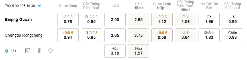 Soi kèo tài xỉu Beijing Guoan vs Rongcheng: 0.85*2/2.5*0.85