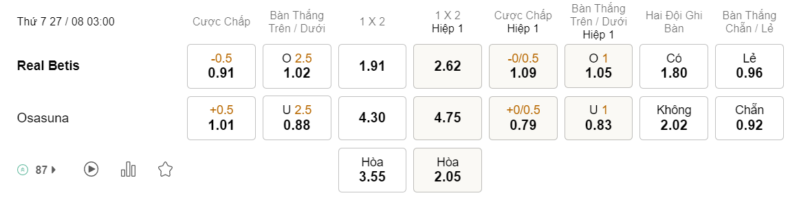 Tỉ lệ kèo Betis vs Osasuna