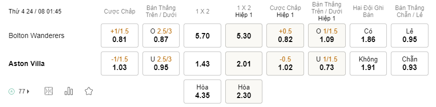 Soi kèo châu Á Bolton vs Aston Villa: 0.81*1/1.5*1.03