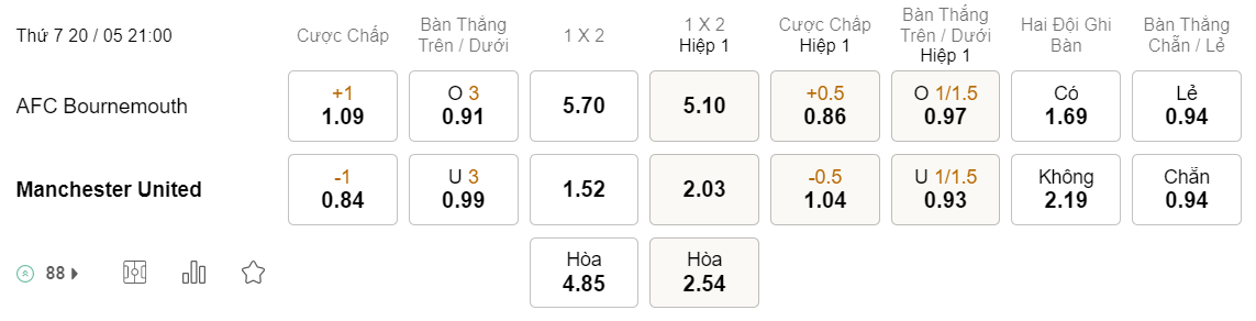 Soi kèo hiệp 1 Bournemouth vs MU: 0.86*0.5*1.04