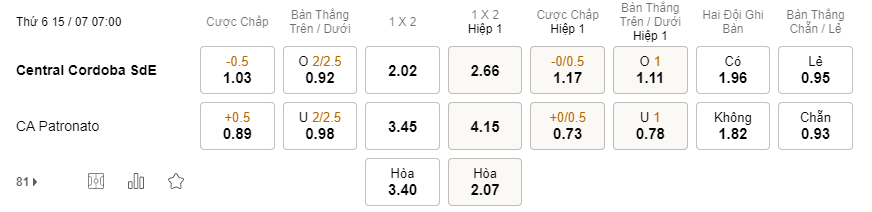 Tỉ lệ kèo Central Cordoba vs Patronato