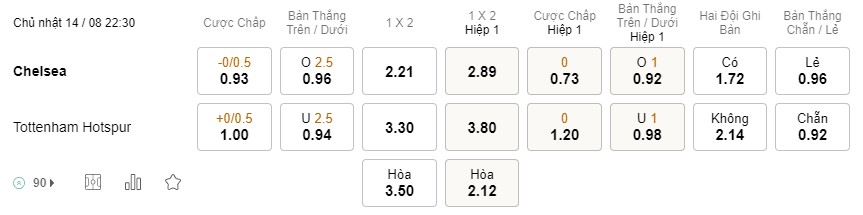 Soi kèo châu Á Chelsea vs Tottenham: 0.93*0/0.5*1.00