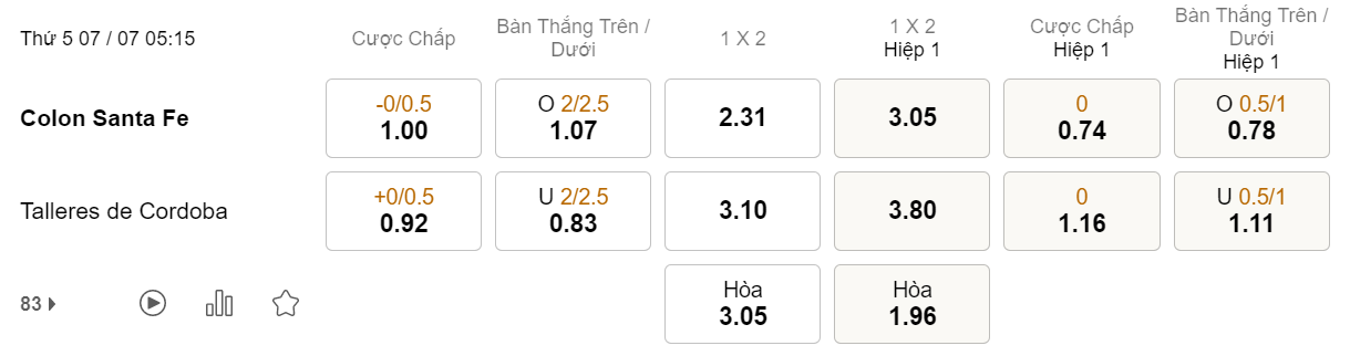 Soi kèo hiệp 1 Colon vs Talleres: 0.74*0*1.16