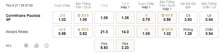 Soi kèo Châu Á Corinthians vs Always Ready: 1.02*2.5*0.88