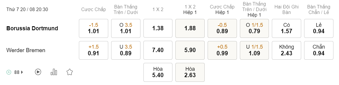 Tỉ lệ kèo Dortmund vs Werder Bremen
