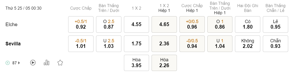 Soi kèo tài xỉu Elche vs Sevilla: 0.87*2.5*1.03