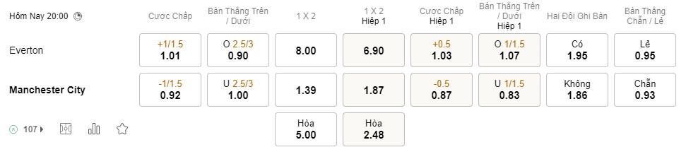 Tỉ lệ kèo Everton vs Man City