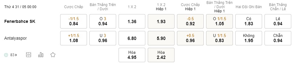 Soi kèo hiệp 1 Fenerbahce vs Antalyaspor: 0.92*0.5*0.96