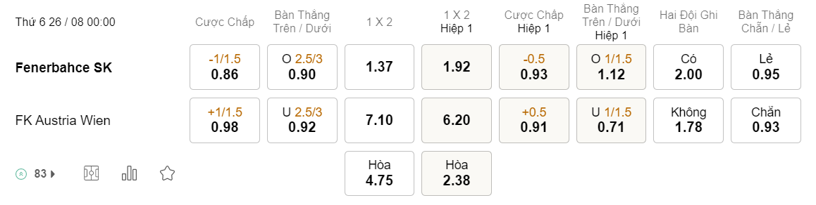 Tỉ lệ kèo Fenerbahce vs Austria Vienna