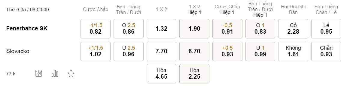 Tỉ lệ kèo Fenerbahce vs Slovacko