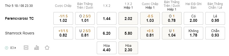 Tỉ lệ kèo Ferencvarosi vs Shamrock Rovers