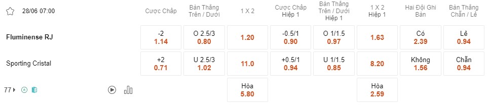 Tỉ lệ kèo Fluminense vs Sporting Cristal
