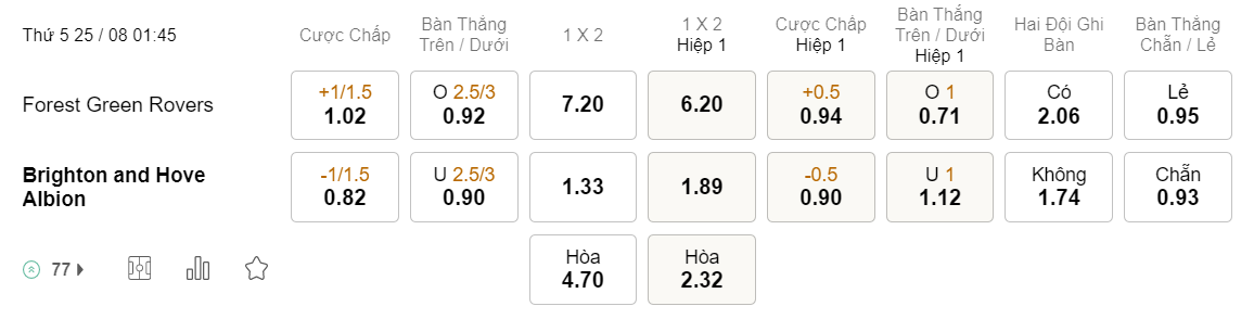 Soi kèo châu Á Forest Green vs Brighton: 1.02*1/1.5*0.82