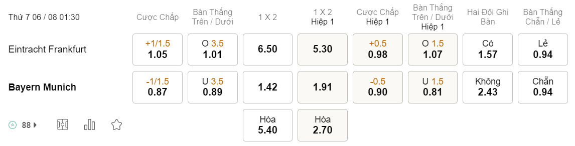 Soi kèo tài xỉu Frankfurt vs Bayern: 1.01*3.5*0.89