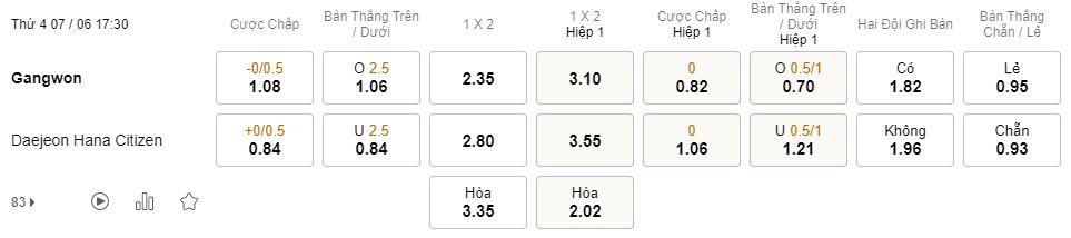 Tỉ lệ kèo Gangwon vs Daejeon