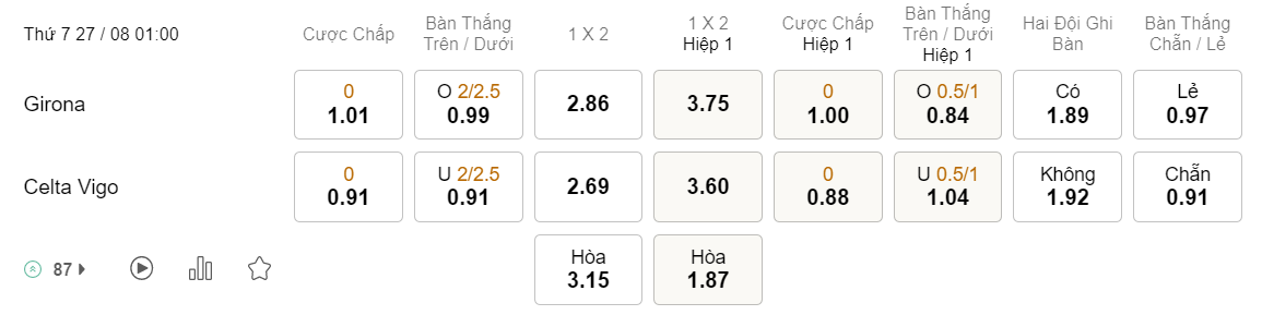 Soi kèo hiệp 1 Girona vs Celta Vigo: 1.00*0*0.88