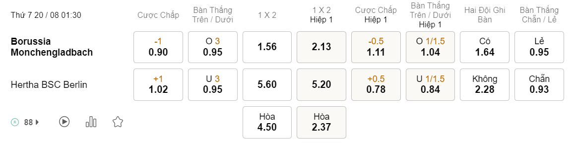 Tỉ lệ kèo Gladbach vs Hertha Berlin