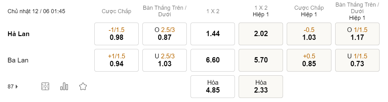 Tỉ lệ kèo Hà Lan vs Ba Lan