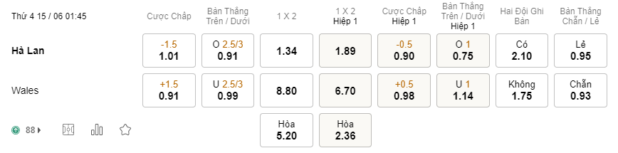 Soi kèo châu Á Hà Lan vs Wales: 1.01*1.5*0.91