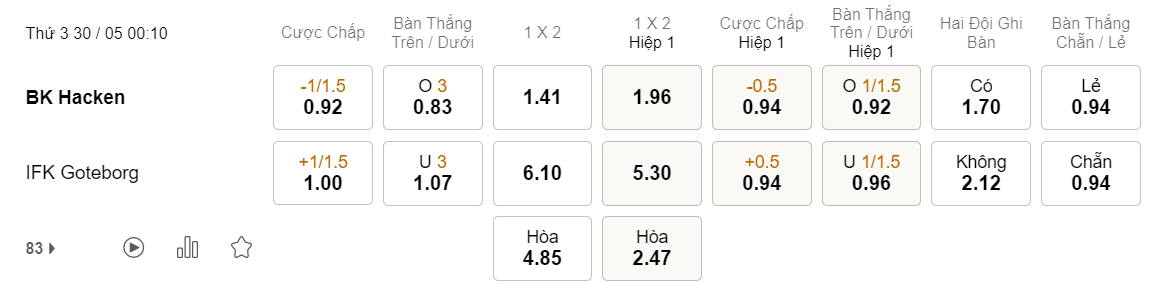 Soi kèo tài xỉu Hacken vs Goteborg: 0.83*3*1.07