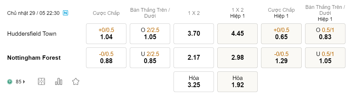 Tỉ lệ kèo Huddersfield vs Nottingham