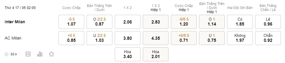 Soi kèo hiệp 1 Inter vs Milan: 1.20*0/0.5*0.71