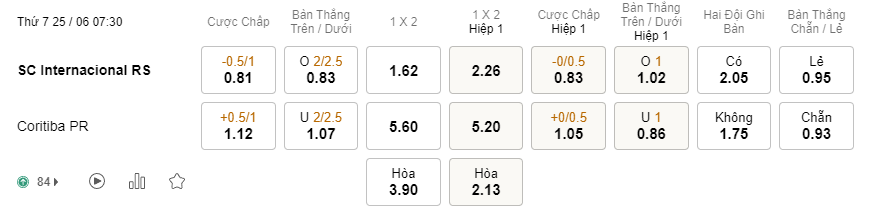 Soi kèo hiệp 1 Internacional vs Coritiba: 0.83*0/0.5*1.05