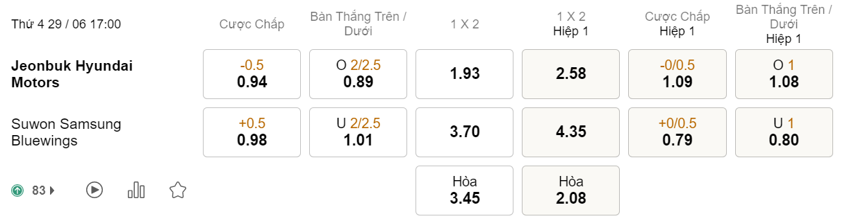Soi kèo hiệp 1 Jeonbuk vs Suwon Bluewings: 1.09*0/0.5*0.79