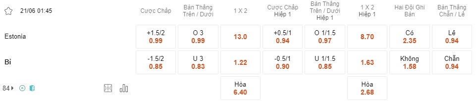 Soi kèo châu Á Estonia vs Bỉ: 0.99*1.5/2*0.85