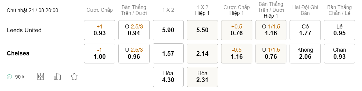 Tỉ lệ kèo Leeds vs Chelsea