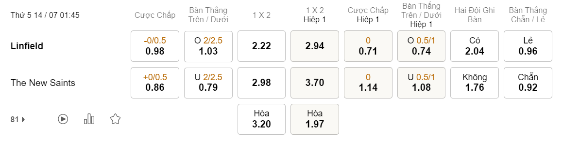 Soi kèo hiệp 1 Linfield vs The New Saints: 0.71*0*1.14