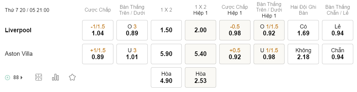 Tỉ lệ kèo Liverpool vs Aston Villa