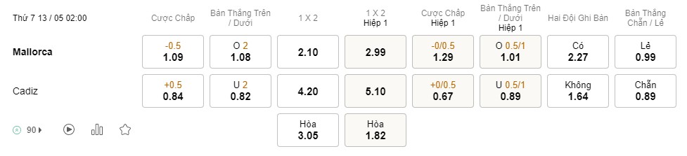 Soi kèo hiệp 1 Mallorca vs Cadiz: 1.29*0/0.5*0.67
