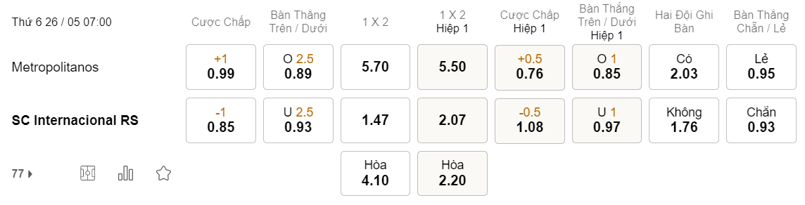 Tỉ lệ kèo Metropolitanos vs Internacional