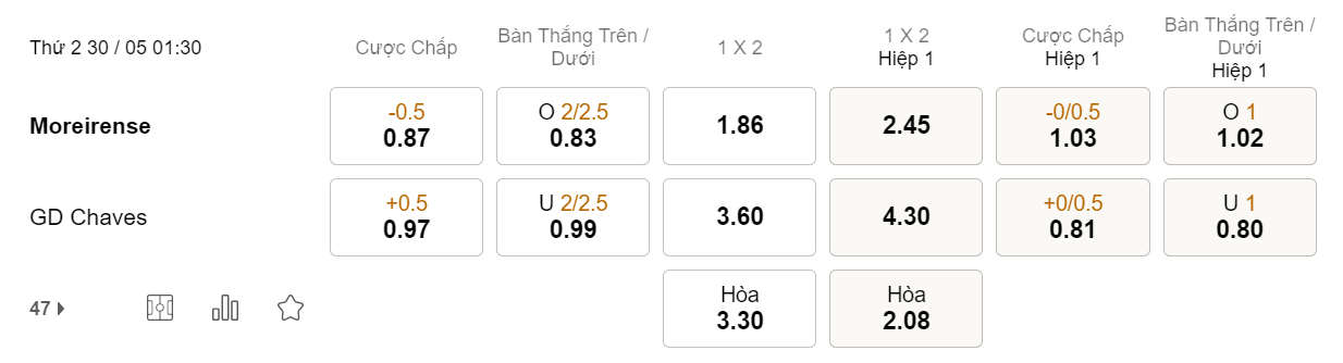 Soi kèo hiệp 1 Moreirense vs GD Chaves: 1.03*0/0.5*0.81