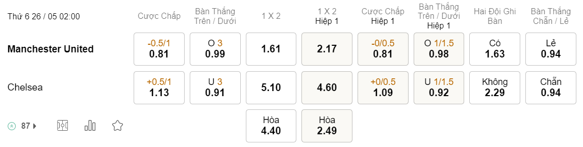 Soi kèo hiệp 1 MU vs Chelsea: 0.81*0/0.5*1.09